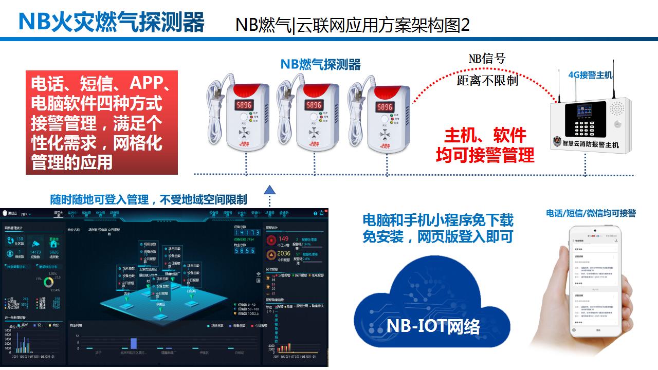 NB燃气报警器,采用低功耗设计,用来检测环境可燃气体泄露报警提示用的,与传统的燃气报警器相比,具有免布线、免安装、易维护、低功耗等诸多优势,能满足大数据,物联网的智慧消防无线报警系统的应用。通过NB-IoT物联网将信号传输到物联网管理平台,管理平台收到报警信号后,可实现通过小程序、PC管理平台、网络短信等推送相应的管理员,从而降低火灾事故发生所带来的损失,最大限度捍卫生命和财产安全。待机1年以上,报警后不需要主机,直接上传云平台,支持电话、短信、PC软件和手机APP接警管理,免布线、易安装、免SIM卡、免通讯费,不仅仅用于工厂,还可以用于居家消防,小烟感,大作用,每家每户都需要,市场需求潜力巨大,报警后自动拨打用户电话,最多支持10组用户号码,提供开放协议,加速平台软件厂家NB燃气报警器的上市。NB燃气具有安装方便等显著优势,被广泛适应用于智慧小区、养老院、酒店、工厂等消防报警领域。