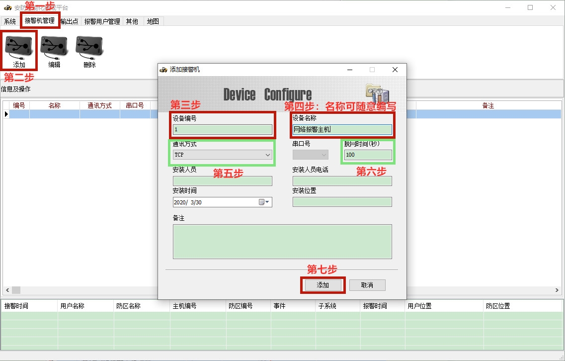 注:由于集成平台通过网络集成时作为服务器,所以,存在多台报警主机上传到该平台时,也只是增加一个接警机即可。