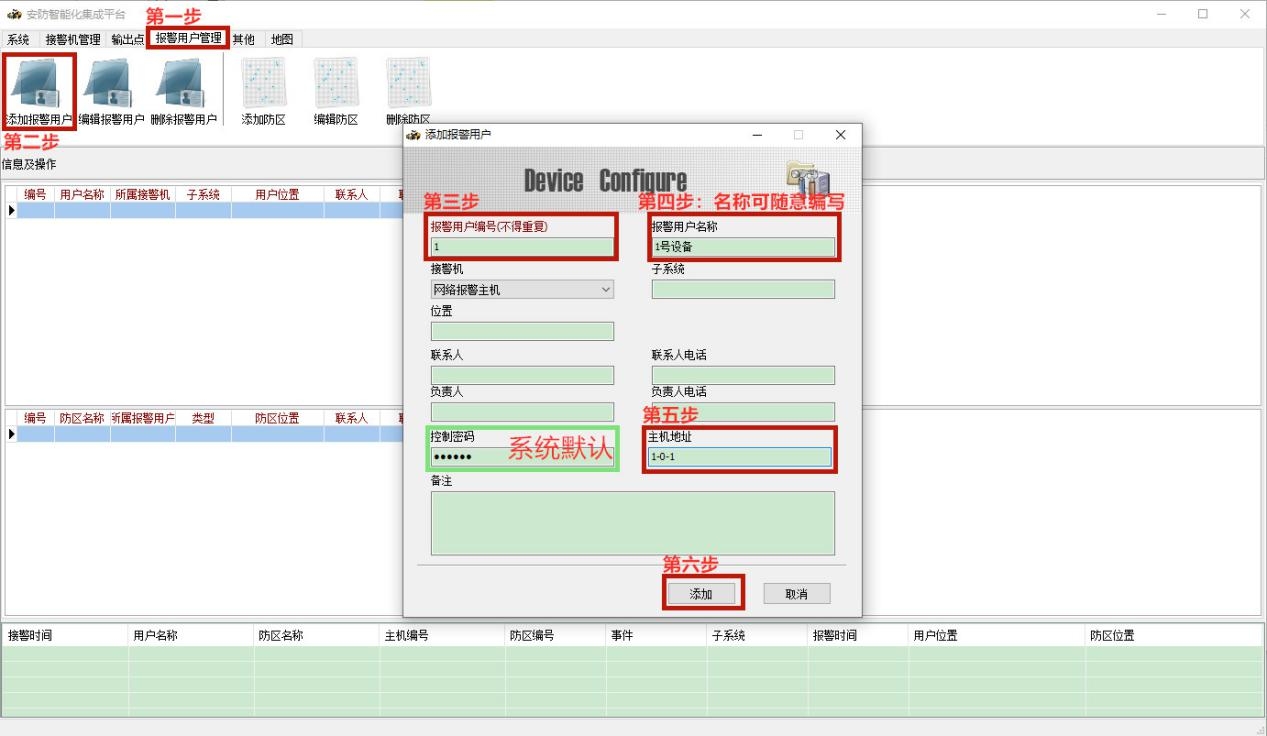 注:主机地址说明:固定格式为AA-B-CC,其中的AA是报警主机的系统地址,B为0或1,其中0表示通讯总线的设备,1表示键盘接口的设备,CC是通讯总线或键盘接口的设备地址号,比如:1-0-1,表示为1号总线主机的1号模块。如果接的是主板自带防区,主机地址固定是:AA-0-0。