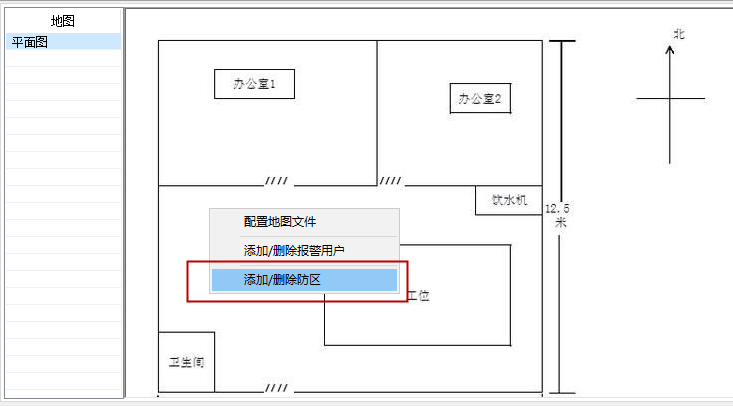 1,选中左边的电子地图名称,在右侧地图上鼠标左键选择“添加/删除防区”按钮,如下图: