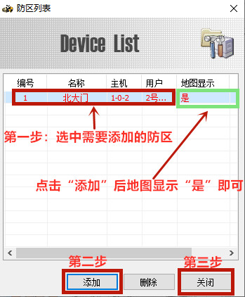 2、在弹出“设备列表”对话框里面,选择需要加入电子地图的设备。鼠标选中编号后,在下方点击“添加”按钮后,再点击“关闭”按钮。